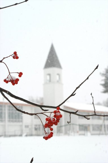 いつもの小学校も、雪をかぶった ナナカマドの実と一緒に撮ってみると とっても新鮮だったりいたします |