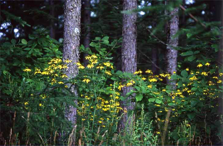 この黄色い花、オオハンゴンソウは富良野・美瑛でたくさん見られます。 前はあんまり好きじゃなかったんだけど、「北の国から・98時代」を見てから とても好きな花になってしまいました(笑)。 こういう暗い林を背景にしたら、その色がさらに引き立ちました。 |