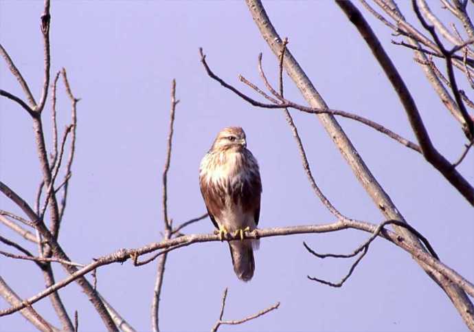 同じタカの仲間でも、このノスリはやさしい顔をしています。 目がくりくりしていて可愛いでしょう? 水元公園にも時々現われますが、北海道ではごく普通に 頭の上を飛んでいたりします。 |