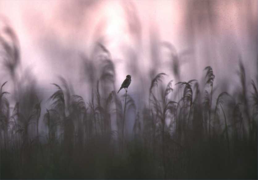 同じく2001年、北海道のウトナイ湖のバードサンクチュアリで撮った オオジュリン。声がとてもきれいな鳥です。 そんなに珍しい鳥ではないけれど、風景写真としてよい感じです。 | |