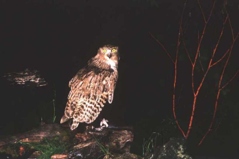 2001年、道東を旅した時に撮ることができたシマフクロウ。 北海道に130羽くらいしかいません。旅館で餌付けされている個体とはいえ、 実際に間近で見ることのできた時の感動といったら、もう…!! 深夜、わずか5分間くらいの息の詰まるような遭遇でした。 |