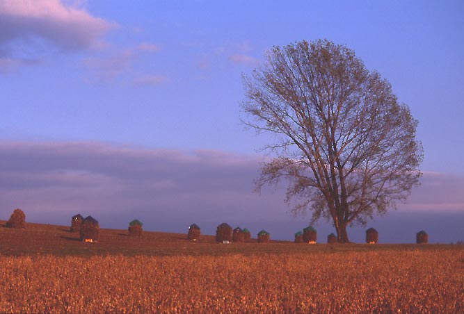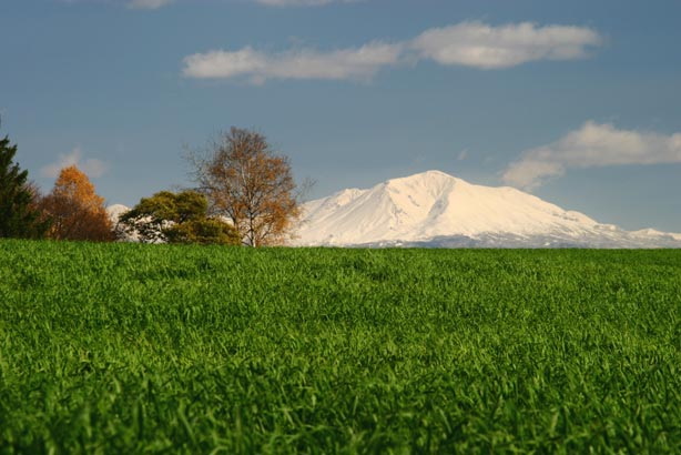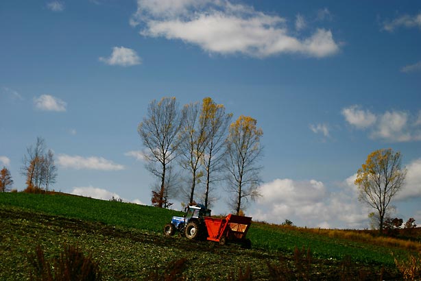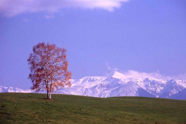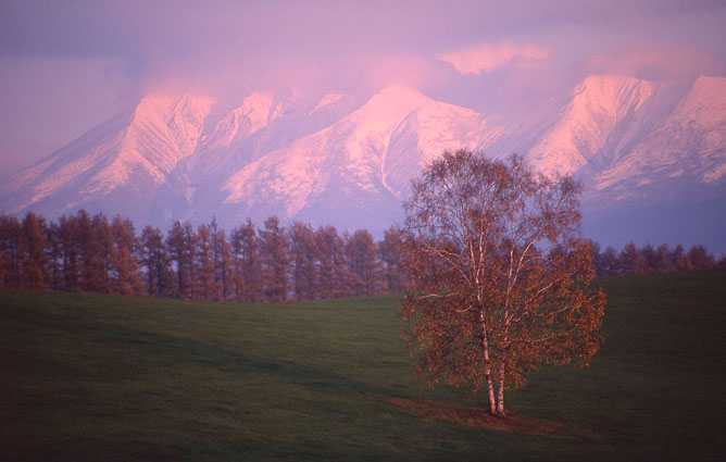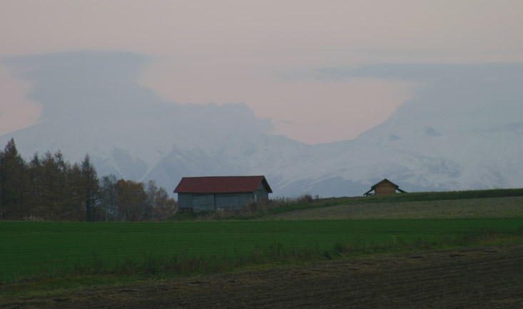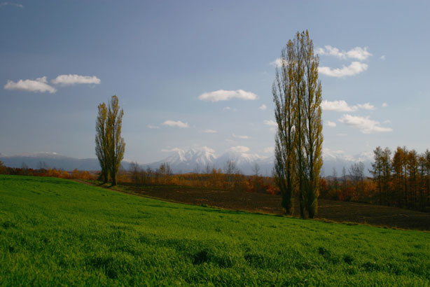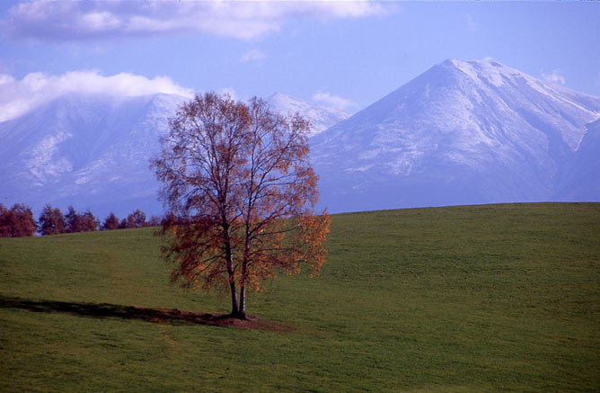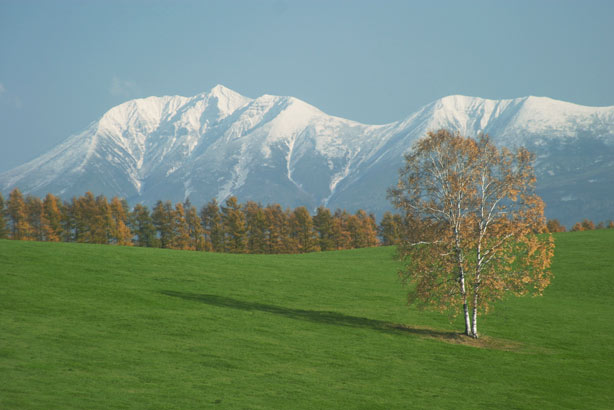 大好きな「りっぱな木」(本名は「哲学の木」)。 今年は豆ニオと一緒に撮ることができました。 ここからも見えるなんて、知らなかったよ…(さすがは雨女) そろそろ陽が傾きはじめた月曜日の午後です。 りっぱな木にもニオにもやさしく暖かな光が当たっていました。 大きな木と、たくさんの小さなニオたち。 なんだかほほえましいような風景でしたね 月曜日の朝、光のパノラマを満喫したあとで美馬牛小学校へ。 すると、ここでも朝の光が楽しませてくれました。 もう少し待ってみようよ…と待機していると、予想通りに 小学校の塔にも、手前の草にも眩しい光が当たりました もう一枚、小学校の塔の遠景です。 これは千代田の丘の近くの高台から、 カラマツ越しに見えた風景。 手前の黄葉が彩りを添えていました 家族の木を訪ねてみると、ここでもビートの収穫中。 青空の下、赤い作業車がくるくると走り回っていました。 ビートの収穫は業者さん?が回ってくる順番が決まっていて スケジュール厳守なのだとペンションのご夫婦が教えてくれました 月曜のお昼過ぎの赤羽の丘。 今日は山が見えていたので、いつもとは違う角度から 撮ってみました。 ちなみに反対側に見えていた旭岳もとてもきれいでした こちらもおなじみの「二つ小屋」。 …なのですが、なぜか今回撮ったのはこの1枚だけ。 山がもうちょっと見えたら、とか、光が当たったら…などど 贅沢を言っているうちに取り損なってしまいました。バカですね… 最後は白樺(本名はもちろん「絵本の木」なのですが)の写真で。 まずは手前のビート畑と一緒に遠くから撮ってみました。 ビートの葉っぱがキラキラ光ってきれいでした。 去年はこの畑いっぱいにキカラシが咲いていたそうです 土曜日は本当にお天気がよく、お山がきれいに見えていました。 こちらは十勝岳(トカちゃん)とのツーショット。 今まで撮ったことのない青・白・緑の背景ですね トカちゃんが出てきたら、オプちゃんも出て来ないわけにはいきません。 オプタテシケ山(オプちゃん)と一緒に撮るためには 結構高いところまで登らないといけません。 脇目も振らずに登っていって、「どうかな?」と振り返る瞬間が大好きです 大雪山と呼ばれますが、大雪山という名前の山はなく、 旭岳を主峰とした山系のことを指すんですね。 向かって右側のきれいな形の山が美瑛富士です。 どの山との組み合わせがお好きですか? ほぼ同じ場所から撮った、夕方の写真。 私は結構、このアングルも好きです。 でも、どの山との組み合わせが好きかといえば答はありませんね。 みんな好きだし、それにその時きれいに見えてる山を撮るしかない(笑) この夕方の写真は月曜日に撮ったものです。 今回はものすごい朝焼けとか夕焼けを撮ることはできませんでした。 でも、晴れていただけで充分です! ものすごい朝焼けとか夕焼け(笑)のお楽しみは取っておきましょう…