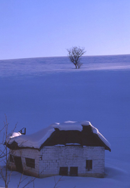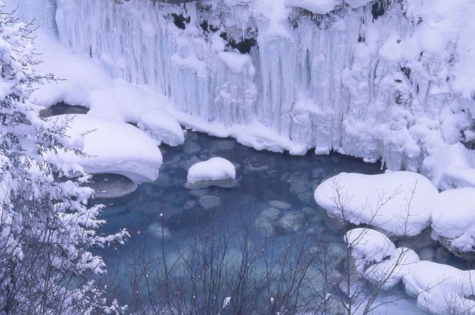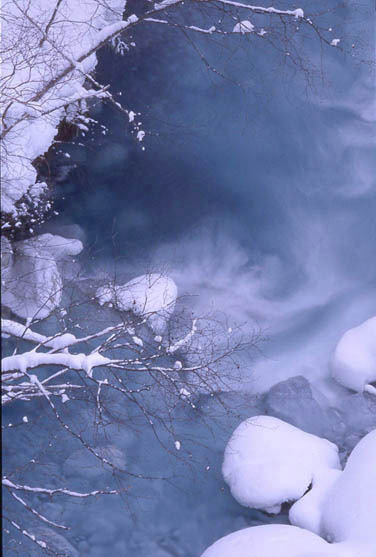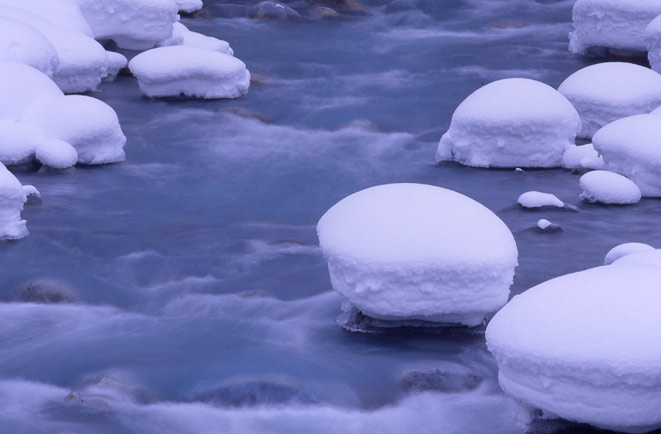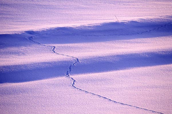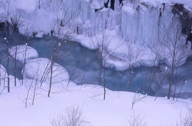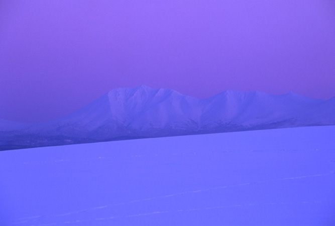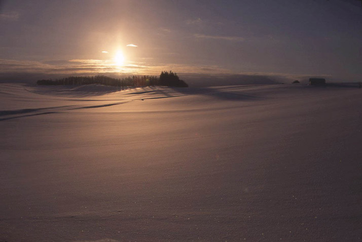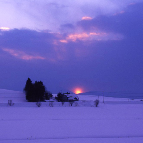 お天気が悪くても、美瑛川の水はいつもきれいな青。 白髭の滝を撮りに行ったのですが、今回は別の風景に目が行きました。 自然の力が作った、見事な雪と氷の彫刻でした。 (「白金温泉氷瀑まつり(ウソ)」の全体像はこちらをどうぞ) もう1枚、美瑛川。白金温泉の橋の上から撮りました。 温泉の湯元が近い関係で川が水色なのだと聞いていますが、 深みの青い色には吸い込まれそうになりました。 石に積もった雪とのコントラストがきれいですね (もうちょっと下流で撮った写真はこちらをどうぞ) 2日目の朝。気温は−15℃くらいだったでしょうか。 憧れのサンピラー(太陽の光が柱状にみえる状態)には あったか過ぎましたが、その雰囲気だけ味わうことができました。 よくみると太陽が雪だるまみたいな形になっています 太陽が顔を出すと、みるみる空は青くなり 美しい冬の1日が始まりました。 雪が朝日の色に染まってキラキラ輝いています 上の写真にちょこんと写っている「二つ小屋」にズームイン。 カラマツ林の影がすぐ近くまで長く伸びています。 雪が光って、砂漠のようにも見えるから不思議です。 手前にはキタキツネの足跡が点々と続いていました 冬の美瑛では、こんな風に動物たちの足跡を楽しめます。 キタキツネは暗いうちに歩き回るとのことで、明るい時には めったに見られないそうです。 (でも、運良く遭遇したときにお師匠が撮ったのがこちら) 山々に掛かった雲もどんどん消えていきました。 気分が良いので高台に昇って美馬牛小学校を撮りました。 この場所、秋に来たときは雨と雪とに邪魔されて 山はおろか小学校の屋根すら見えなかったんですよねぇ… お天気の神様、そして心の師匠の前田真三さん、ありがとう!! 冬季通行止めとなる千代田の丘からの眺めも撮りたくなって ひとりスノーシューで山登りを決行!(ぜいぜい…) 小学校が撮れる場所まで行くことは私の足では不可能でしたが 今まで拝めなかった十勝の連山を撮ってみました。 (次の日に別のところで撮った美馬牛小学校の遠景はこちら) 去年の夏にようやく見つけた納屋 (わかりやすいところにあるんですけどね…)。 はじめて撮る雪景色は、やっぱりすてきでした。 屋根が壊れる前だったらなあ…って、それは言わない話 3時を過ぎる頃から、雪が何となく色づきはじめました。 夕焼けが見られそうです。ありがたいことです。 二つ小屋と十勝岳の記念写真を撮った後、 夕焼けの写真を撮りに白樺の木へと急ぎました 白樺と山々の夕焼けを満喫した後(その写真は「白樺」編で)、 消え残る夕映えを求めてパッチワークの路方面へ。 夕陽のきれいな木を目指していたんだけれど、思わずストップ! 憧れのオプちゃん(オプタテシケ山)が静かに微笑んでいました こちらは翌日の落日の風景。 夕方のこの時間だけ雲が出てしまい、きれいな夕焼けは 撮れませんでした(っていうか、それは贅沢すぎるというものです)。 でも、ぽこん!と小さな夕陽が頑張って見送ってくれたのでした