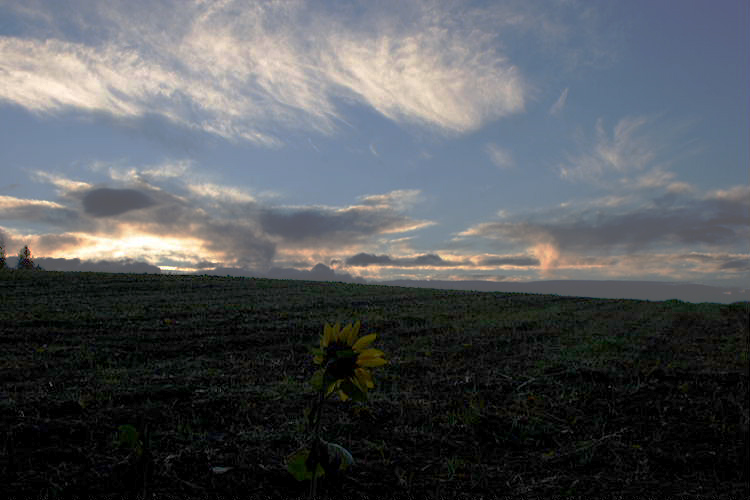 一輪だけ刈り残された畑のヒマワリが黙って空を見つめていました