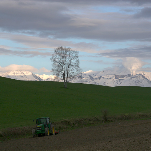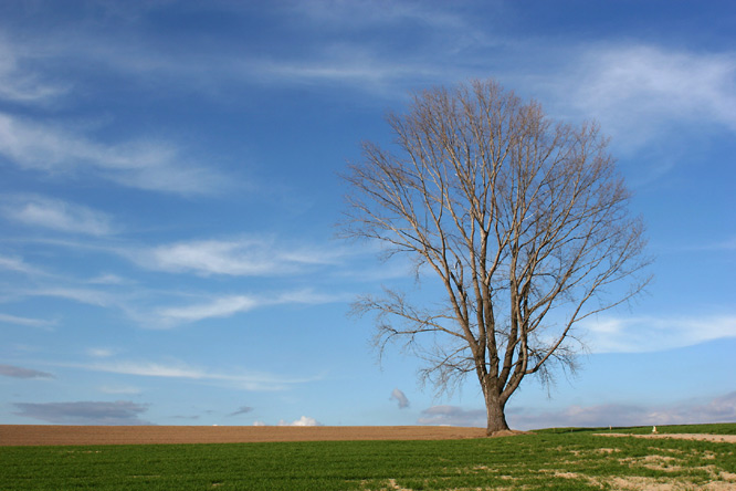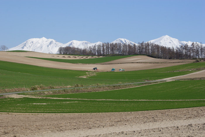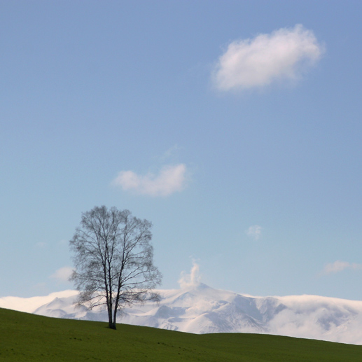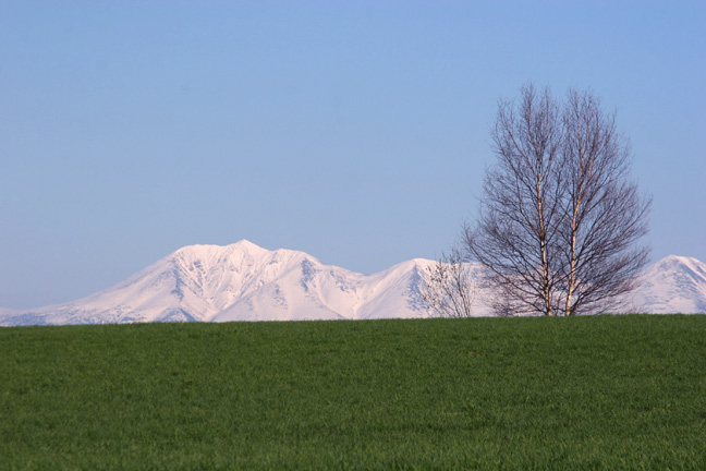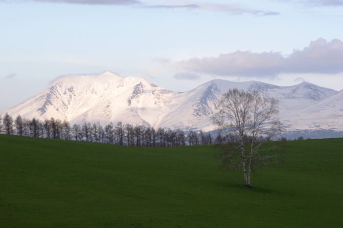 5月の中旬といえば、東京ではそろそろ初夏なのですけれど、 まだまだオプちゃん(笑)。 もう1枚、「がんばれ!トラクター」。 ここからは農作業を離れて、春の風景。 千代田の丘近くの高台から。 最終日、特に撮るものもないのできれいな風景を求めて徘徊中、 これも、場所は忘れたけれどパッチワークの丘のどこか。 上から4枚目の写真を撮っていた時に、ふと反対側を見ると 新緑の写真をもう1枚。 最後に、おなじみの木たちにも登場していただかなければ。 三本立ちの白樺(絵本の木)も、牧草のきれいな緑と といいつつ、さらにもう1枚。