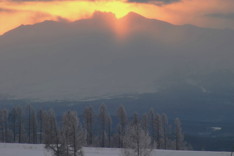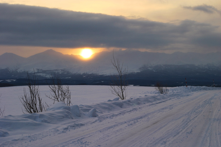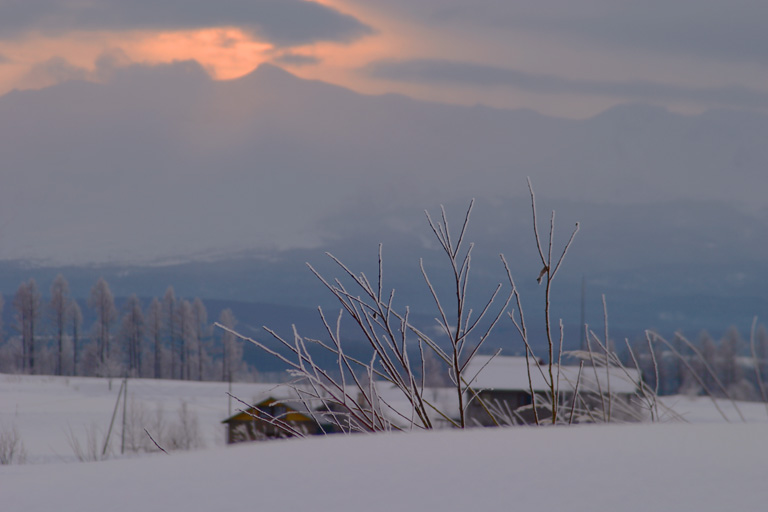 1月24日、旭川地方気象台の天気予報は「曇りのち雪」でした。 曇りという予報の割には東の空だけは明るく(星も少々見えていました)、 曇ってはいるけれど、とても冷えている。 小学校を撮って戻ってきたら、山から朝日が昇っていました。 今回はペンションのお客さんが他にいなかったこともあり、 この朝で最も派手な写真(これで)。 この上下4枚、ほぼ同じ場所から撮りました。 白い山、ほんのり赤い空、後方に当たるスポットライト、 あるのはわかっていたけれど、撮ったことはなかった