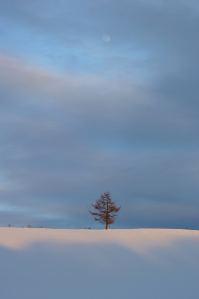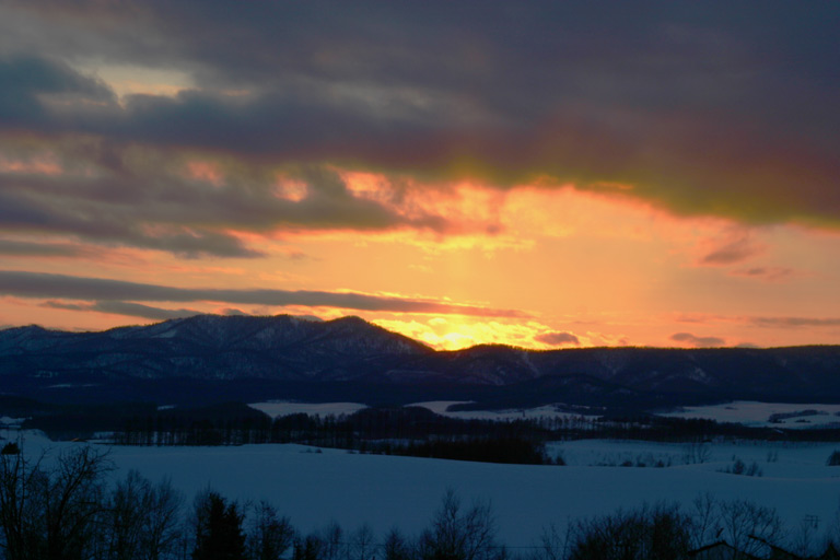 その後ちょっといろいろありまして、4時過ぎに「パノラマロード」方面へ。 夕日を撮るなら絵本の木かな、でも背景の山が見えないからどうしようかな って話をしていたら、気になる風景が視界に入りました。 雪がうっすらと夕陽に映えていました でね、上の場所でばしゃばしゃ写真を撮っているうちに 夕映えとは、あっという間に消え去るもの。 あきらめきれずにもうちょっと車を走らせて、 3日目です。 朝は前のページの写真の通り、日の出は見られたけれど薄曇り。 上の写真を撮った場所から、ちょっとだけ向きを変えて撮った写真。