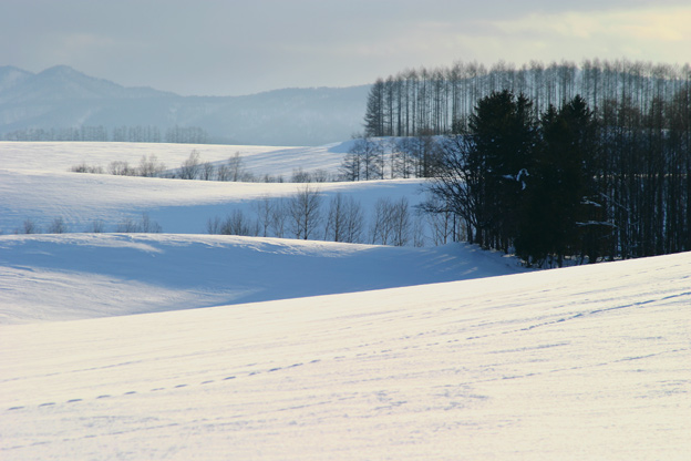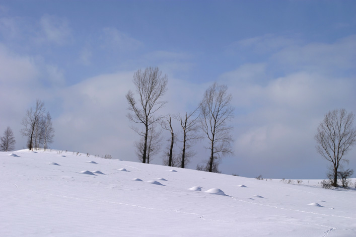 2日目の11時頃、美瑛に到着しました。 「りっぱな木(本名:哲学の木)」は無事だけ確認して、次なる撮影地へ。 3時半過ぎ、ふたたびパッチワークの丘方面へ。 どこで撮ったかよく覚えていないのですが(パッチワークの丘のどこかですね)、 あんまりきれいな青だったので、 雪の斜面だけ撮ってみました。