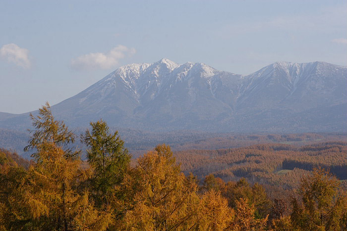 カラマツと少しだけ雪の積もりはじめた山々のコントラストがきれいです