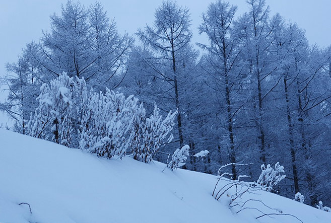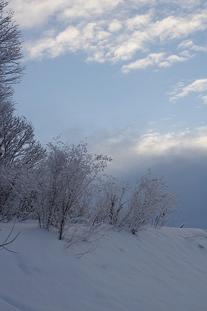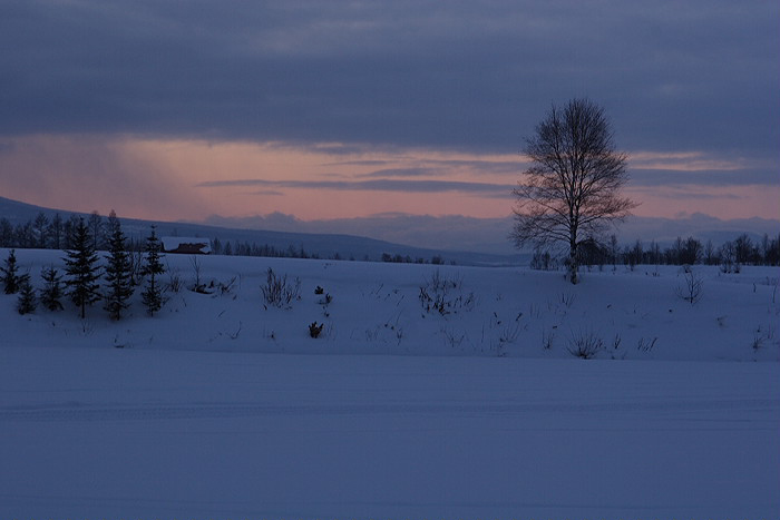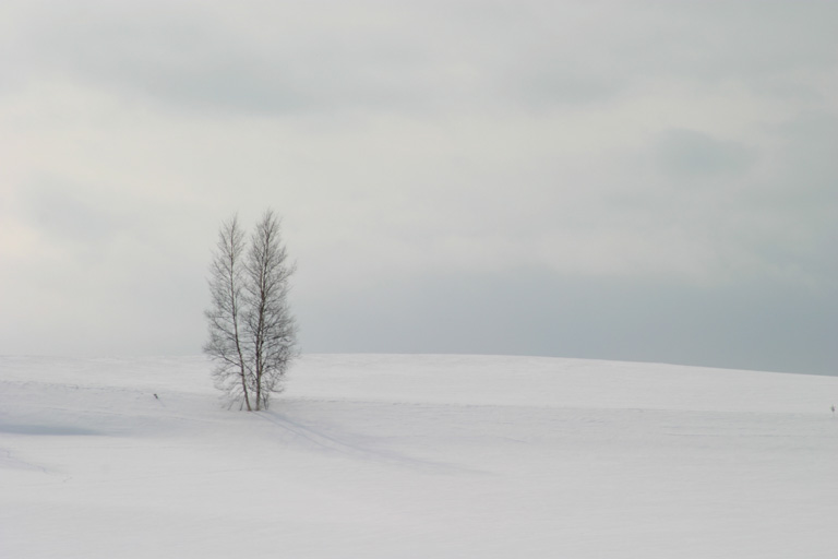 1月27日、旭川空港に着いた時には小雪がちらつき、美瑛に着いてもこんな感じ。 雪は去年より積もっているようでした。 1月28日の朝もこんな感じの曇り空。 もうひとつモノトーン。 上の2枚の写真を撮った直後、大きな鳥が飛び立つのが視界に入りました。 結局、朝ご飯を食べた後も青空が広がることはありませんでした。 エゾシカとかキタキツネ、あるいは鳥に会えないかな〜と思い、 さて、3日目の朝です。 午前中に発表された天気予報は「曇り、昼前から晴れるが夕方から曇り」。 同じくルベシベで撮った1枚。 突然、空が青くなりました。びっくりでしょ?…私もびっくりでした(笑)。 青空が少しずつ広がっていきますが、残念ながらもう帰る時間です。