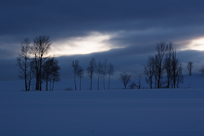 今回は晴天に恵まれなかった分、「雪面」に目がいきました。 雪は白いから、明るさ、空の色によってもいろいろな表情を見せてくれます。 16時半すぎの雪面。淡い色をしています。 さらに夕暮れが近づいてきた頃の雪面。 さらに暗くなりまして、17時頃の空。 えーと、「何年か前にも同じ写真があったじゃない」とは言わないように。 「拓真館」を出て、いきなり広がっていた青空に驚きました。 もっと陽射しが強くなると、さらに雪はキラ☆キラと輝きます。