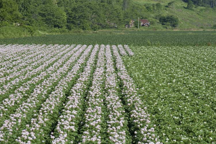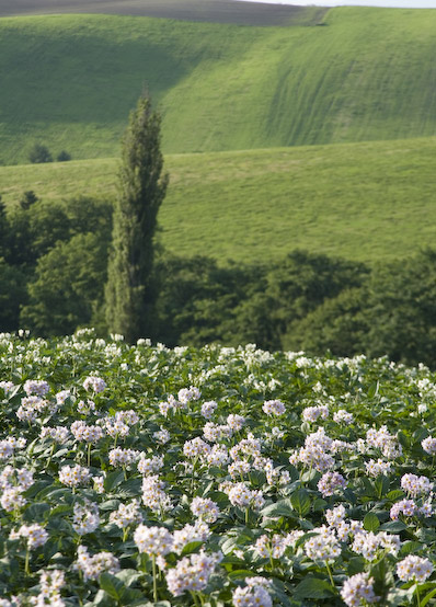 奥の畑の右側はじゃがいも畑。花が咲いている時期は華やかです