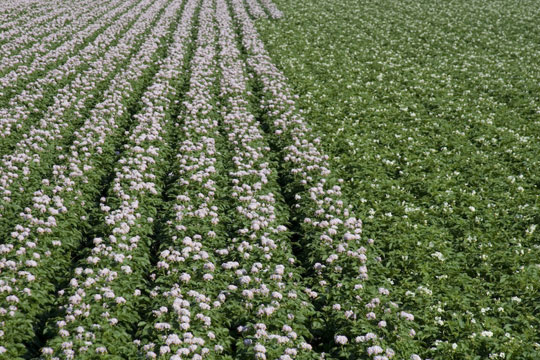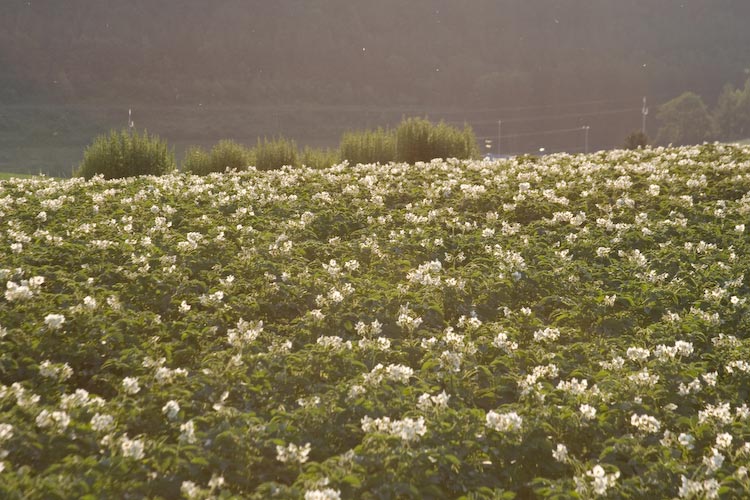 もう1枚、夕方の日差しの中のじゃがいも畑です。