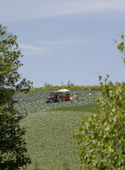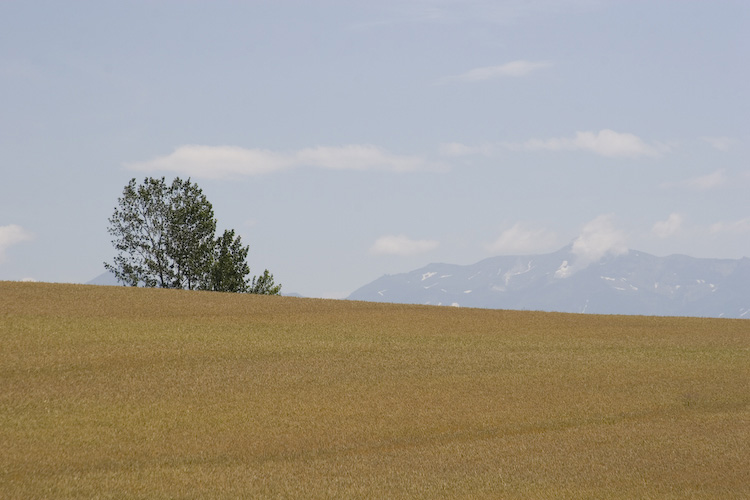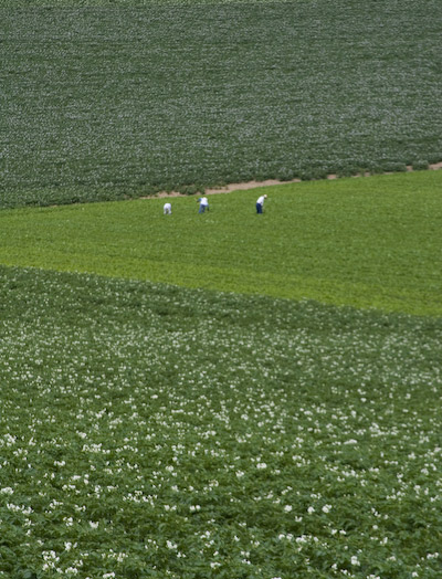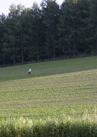 この時期の美瑛の丘のW主演俳優さん。じゃがいもと麦です。 美瑛では、畑の土を守るために毎年違うものを作るのだそうです。 ということで、ここから数枚はじゃがいも畑の写真です。 同じじゃがいもでも、畑で半分ずつ違う品種ということもあります。 上の畑のすぐ近くにも、こんな美しいじゃがいも畑がありました。 ここからは麦畑の写真。 マイルドセブンの丘の近くに、「赤麦」の畑があります。 これは何の畑でしょう? アスパラガスの畑です。 こちらはおなじみのとうもろこし畑。 最後に農作業の風景を…。 ルベシベ方面を走っていると、何かの収穫作業?が行われていました。