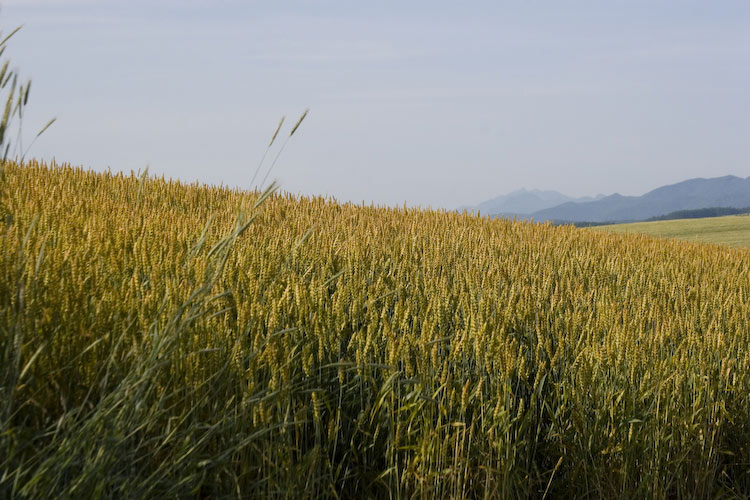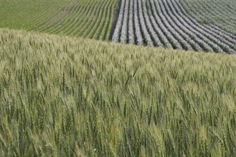 手前の畑は春蒔きの小麦。麦の穂がきれいです。
