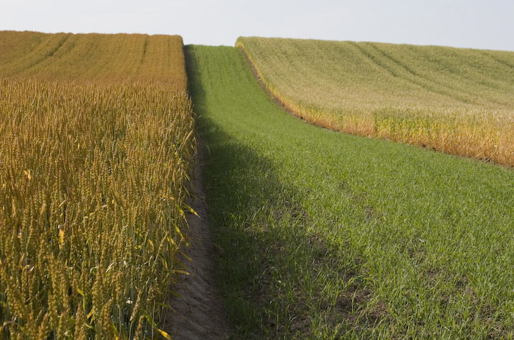 もうすぐ収穫の秋蒔き小麦の手前の畑には、これから育つ苗。