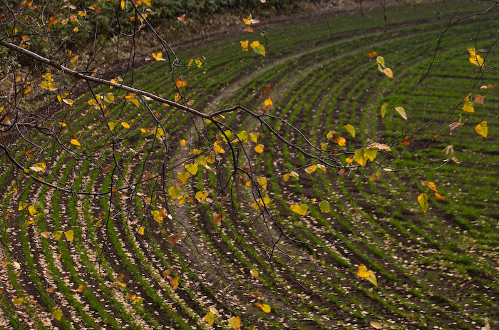きれいな緑色の曲線を描いた畝のひとすじひとすじに