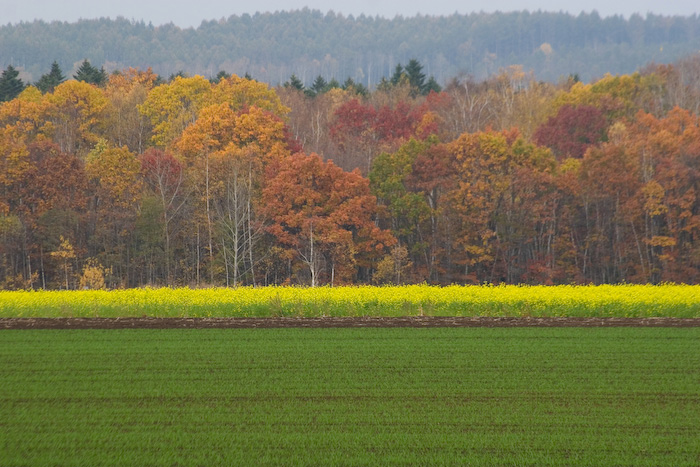 手前のきれいな緑の絨毯と、背景の紅葉・黄葉との