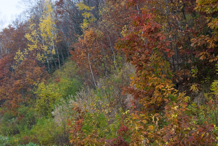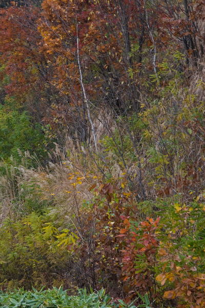 きれいな紅葉を求めて、美瑛を離れて富良野方向へ。 上の写真と同じところで撮りました。 でも、撮るものが何にもなかったわけではなく、 こちらは美馬牛小学校のお向かいの林の木。 北海道の紅葉というと、私が真っ先に思い出すのは「桜」。 こちらは美瑛市街から白金温泉に向かう途中の公園。 ここで印象的だったのは、落ち葉の絨毯。 そしてやっぱりススキを撮る私(笑)。 白金温泉に到着。