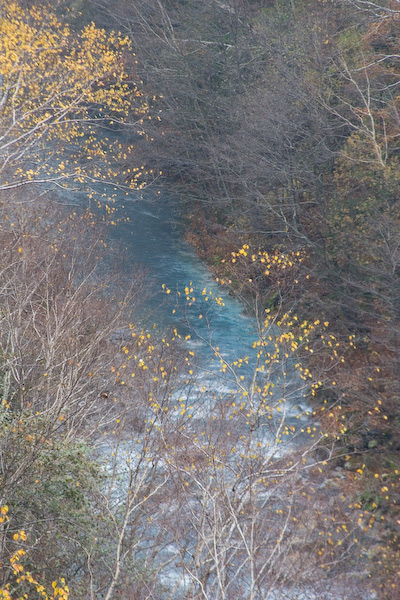滝の反対側。わずかに残った黄葉と川の青い水を一緒に撮りました。