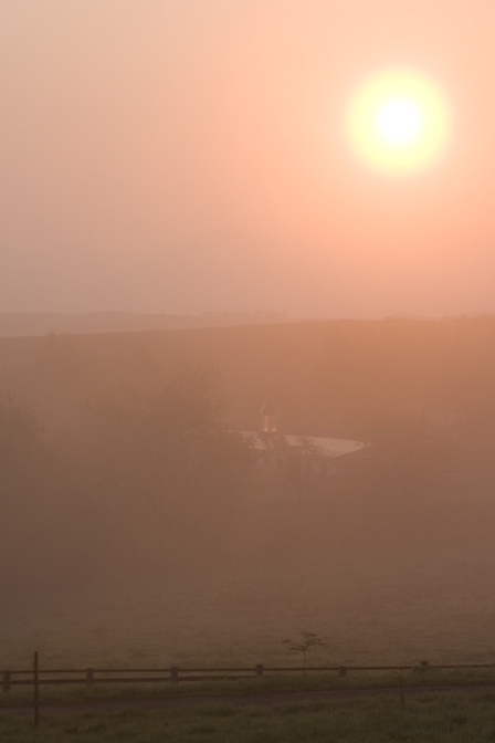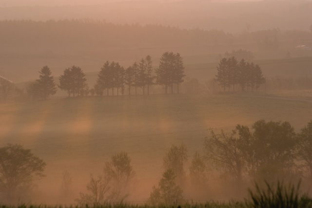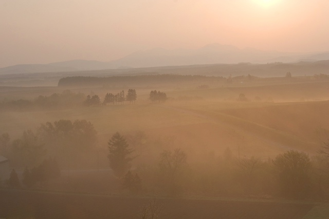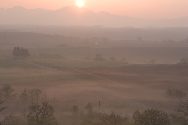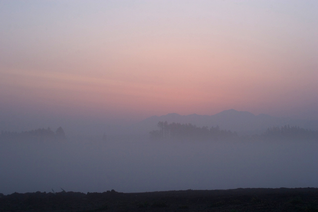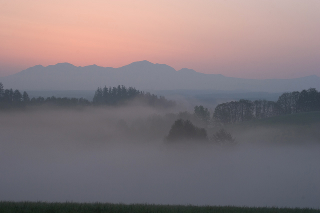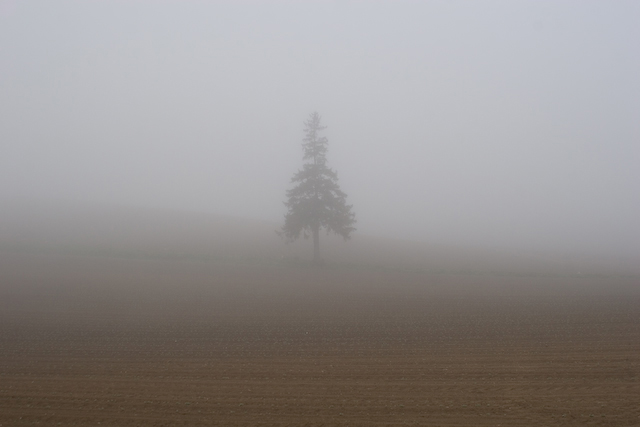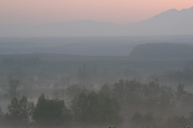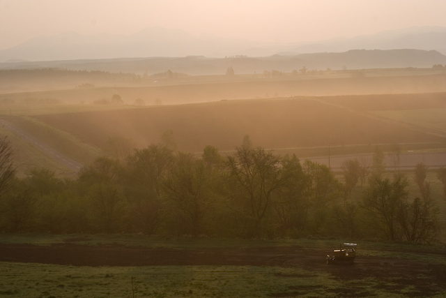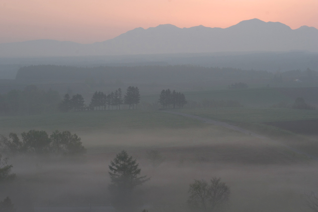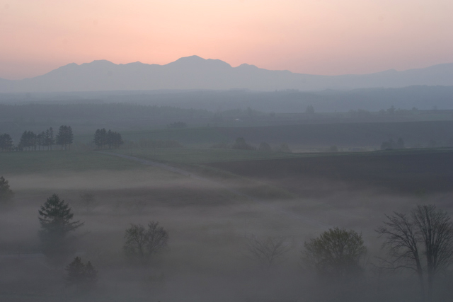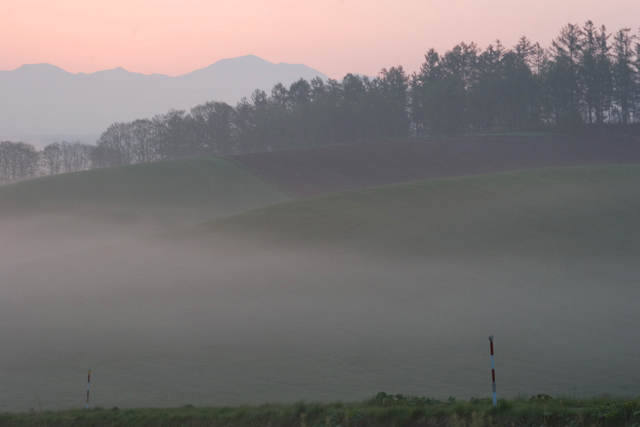 今回の旅では、朝は2日とも同じような感じでした。 4時ちょっと前に千代田の丘に到着。 日の出を待つ間、ちょっと左に目線をうつして 光の当たり具合のちょっとした違いによって でも、いつまでも同じ場所に留まっているのももったいない。 同じく千代田ファームの朝。 上の写真とほぼ同じ場所の数分後の写真。 でも、かすんでいる感じも悪くありません。 秋の朝にも同じ千代田の丘から写真を撮ります。 …と、高台から下界の写真を撮っているうちはよかったのですが でも、この真っ白な風景を作っていたのは霧だけではありませんでした。