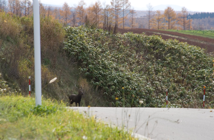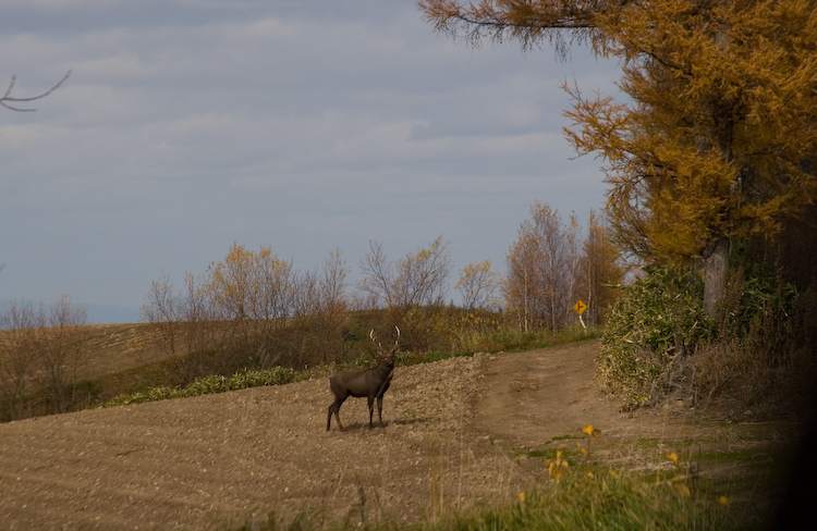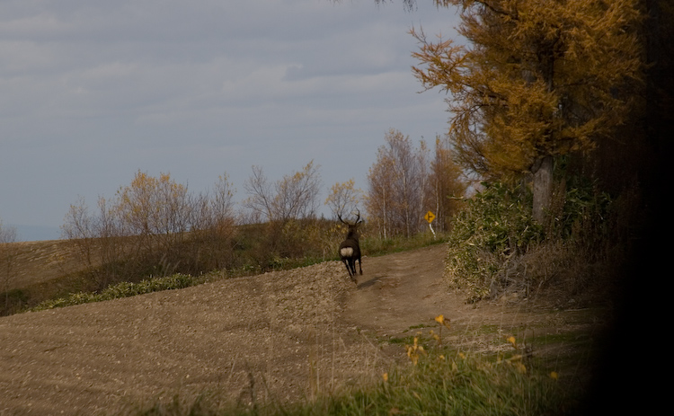 続いて、2日目のお昼前に丘の斜面に現れ、お互いにびっくりしたエゾシカさん。 |