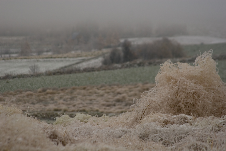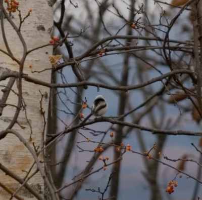| 2日目の午後、白金温泉に立ち寄った後 大雪の山々とカラマツが一面に見渡せるスポットで写真を撮っていたら なにやら聞き覚えのある声。そうです、愛しのシマエナガちゃん! ようやく後姿のみ撮れましたが、普通のレンズではこれが限界でした… |