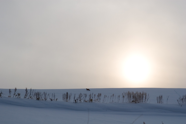 上の写真みたいに、遠くの丘をひとりで歩いているキツネもいれば、