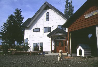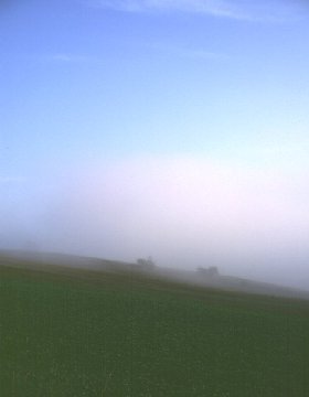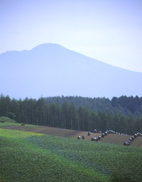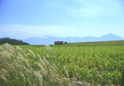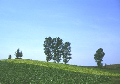 写真をクリックすると大きくなります 麦はすでに刈り取られているところが多く、今回の色の主役は「豆」。鮮やかな黄色が、空の青や周りの緑ときれいなコントラストを描いていました。美瑛では、このあとまた麦が蒔かれて、雪が降る頃まで牧草や黄カラシの花とともに、また違った風景が見られるそうです。 知らない山道をぐるぐる走り回って、平地に降りたところで見つけた樹。「家族の木」と命名しました。「それにしても、ここってどこ?」って悩みながら走り出したら、前に通った場所の近くだったのでビックリ!まだまだ「宝物」が隠れていそうです。 その山道走行の間に見つけた風景。やわらかな初秋の陽射しと、遠くで霞む山。山に向かって行進?しているのが、秋の風物詩・「ニオ」。この季節ならではの1枚でしょう。 「ニオ」とは刈り取った豆の束を積み上げて、天日乾燥させているもののことだそうです。雨除けにかぶせている青や緑のシートがなんとも愛らしいんですよね(お仕事をかわいいって言っちゃ失礼かなあ…)。お師匠との間では「兵隊さん」と呼んでいます。そう見えませんか? 朝霧の風景が撮りたくて、午前5時起床。天気予報は晴れ。だんだん霧が出てきて「しめしめ(死語?)」って思ってたんですが、その後霧は全面に立ち込め、なんにも見えなくなっちゃいました。前田真三さんみたいな朝霧の写真に憧れてたのになあ…。 そんなに甘くはないんですよねぇ。何度でも通わないとダメですね。 いつもと同じところで撮っているんですが、美馬牛小学校はどこ?よーく見ると、右の方にうっすらと塔のシルエットが見えます。この写真が朝の7時前。霧がやっと晴れてきたのは、朝ご飯を食べに戻る頃でした。残念…(ま、こういうのも面白いですけどね) 丘のペンション・ポプラさん。こちらはお風呂も大きいし、お部屋にテレビもあるので、ペンションはちょっと苦手…という方にもおススメです。お料理もおいしいし。犬のサクラちゃんは、写真を撮ろうとしたらしっかり「おすわり」してポーズを取ってくれました。さすがです!(肖像権侵害じゃないよね?) 撮影日 1999.9.4−5使用カメラ:EOS5