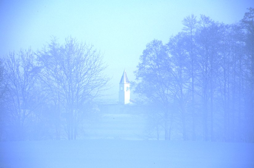 写真とは、時に見たままの風景よりすてきに写ることもあるん だなあ…と痛感したのがこの1枚。 美馬牛小学校の塔が、水色の世界の中にありました。 |