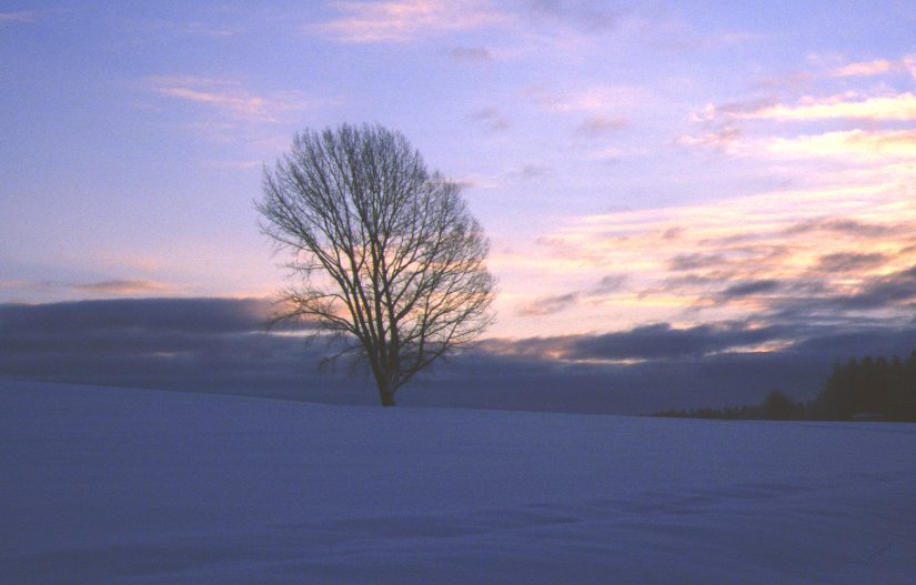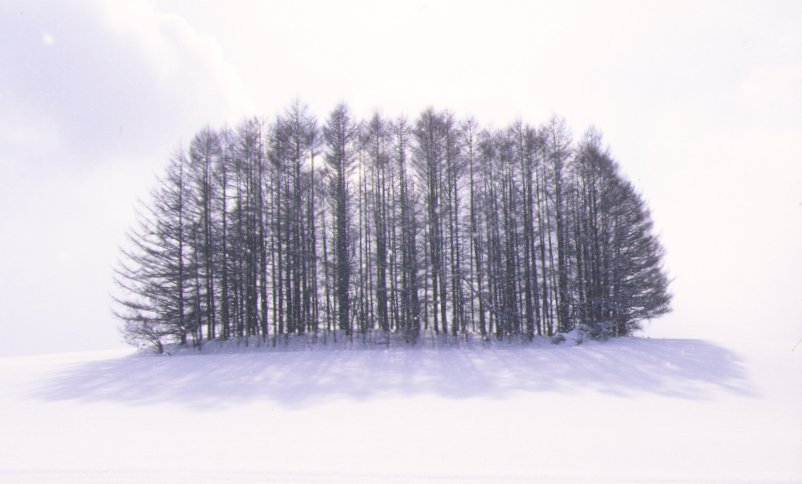 カラマツ3号。真三さんのカラマツ林亡き後、今や美瑛を代表する カラマツといっても過言ではないでしょう。「びえいワイン」その他、 各種パンフレットでよく見かけます。…でも、これ、この冬にようやく 見つけたんです(苦笑)。素直に地図でも見りゃいいのにねぇ。 もっと夕方の影の長い時に撮りたかったんですが、残念ながら タイムアウト…。 |