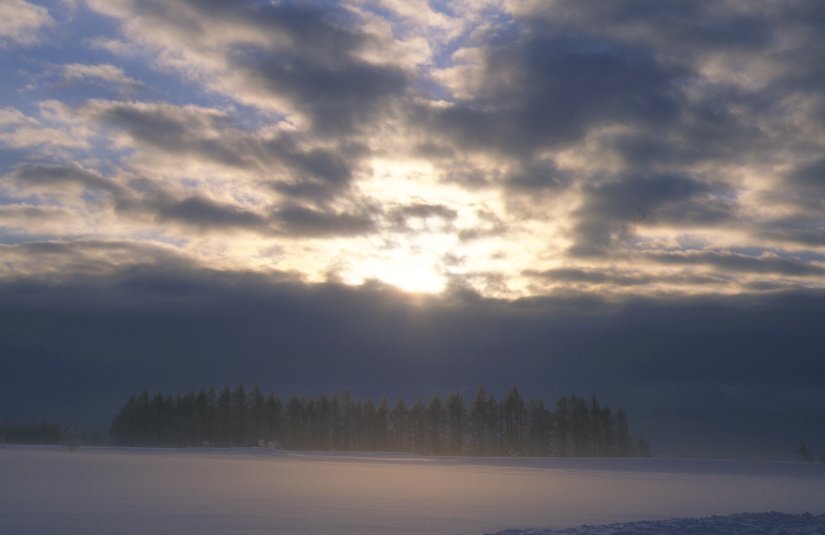 | 「家族の木」から美馬牛方面に向かう道。 今までも通ったことはあったかもしれないんですが、 こんな風に足を止めたのは、きっと初めて。 乳白色の朝もやと、うっすら青い雪が幻想的でさえありました。 |