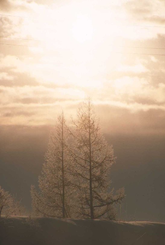 | 朝のまぶしい光。 一瞬ではありましたが、「逆光大好き」人間の私には たまらない光線でした。 真っ白な木々も、とってもきれいだったんですよ。 |